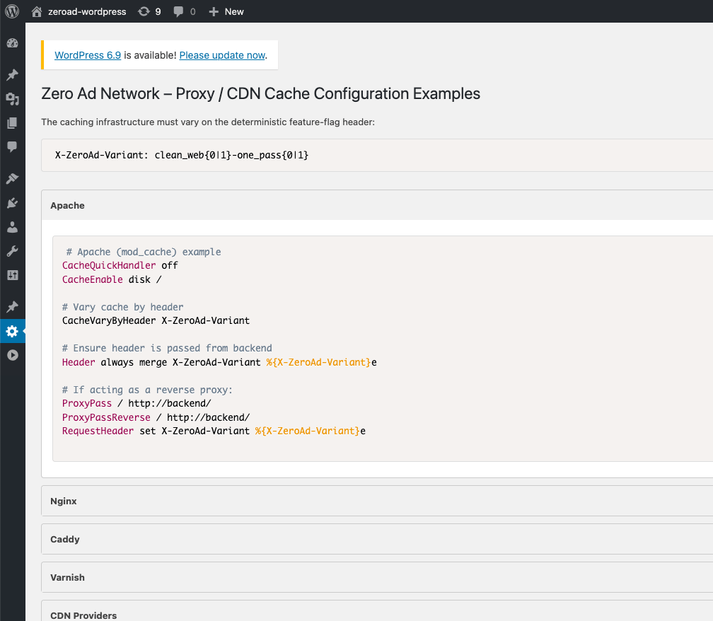 The Zero Ad Network WordPress plugin is available as an easy-to-install plugin (on Github) and is intended for sites participating in the Zero Ad Network program.